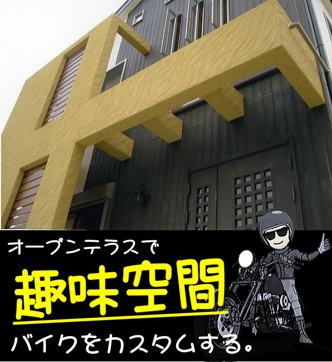 大阪府堺市中区田園にて当社が所有していた中古住宅を購入していただいた秋田様。間口2間の土地にシンプルにそして大胆にをテーマにした家を建てる。車が趣味、バイクが趣味というご主人の趣味趣向に沿ったアイデアをご提案いたしました。